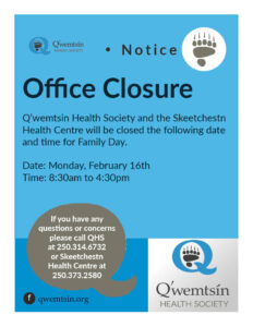 All day 16/02/2026  Q’wemtsin Health Society and the Skeetchestn Health Centre will be closed in observance of Family Day. Date Closed: Monday, February 16, 2026 Re-opened: Tuesday, February 17, 2026 If you have any questions or concerns please call QHS at 250.314.6732.